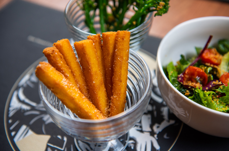 Sirloin steak, fried romaine lettuce, homemade potato fries and demiglace sauce