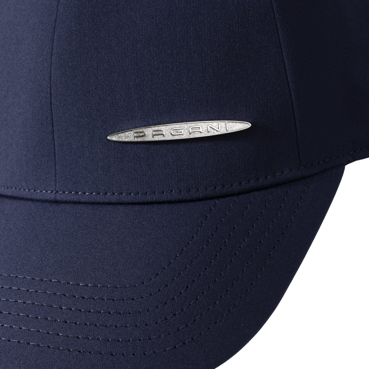 Granatowa czapka Team Collection łączy nowoczesny styl z funkcjonalnością. Z boku zdobi ją metalowa plakietka z logo Pagani w formie owalu, a tył przykuwa uwagę wytłoczonym i haftowanym symbolem czterech wydechów – ikonicznym znakiem marki. Całość uzupełnia subtelnie wyszyta flaga Włoch, podkreślająca autentyczność i włoski charakter projektu.