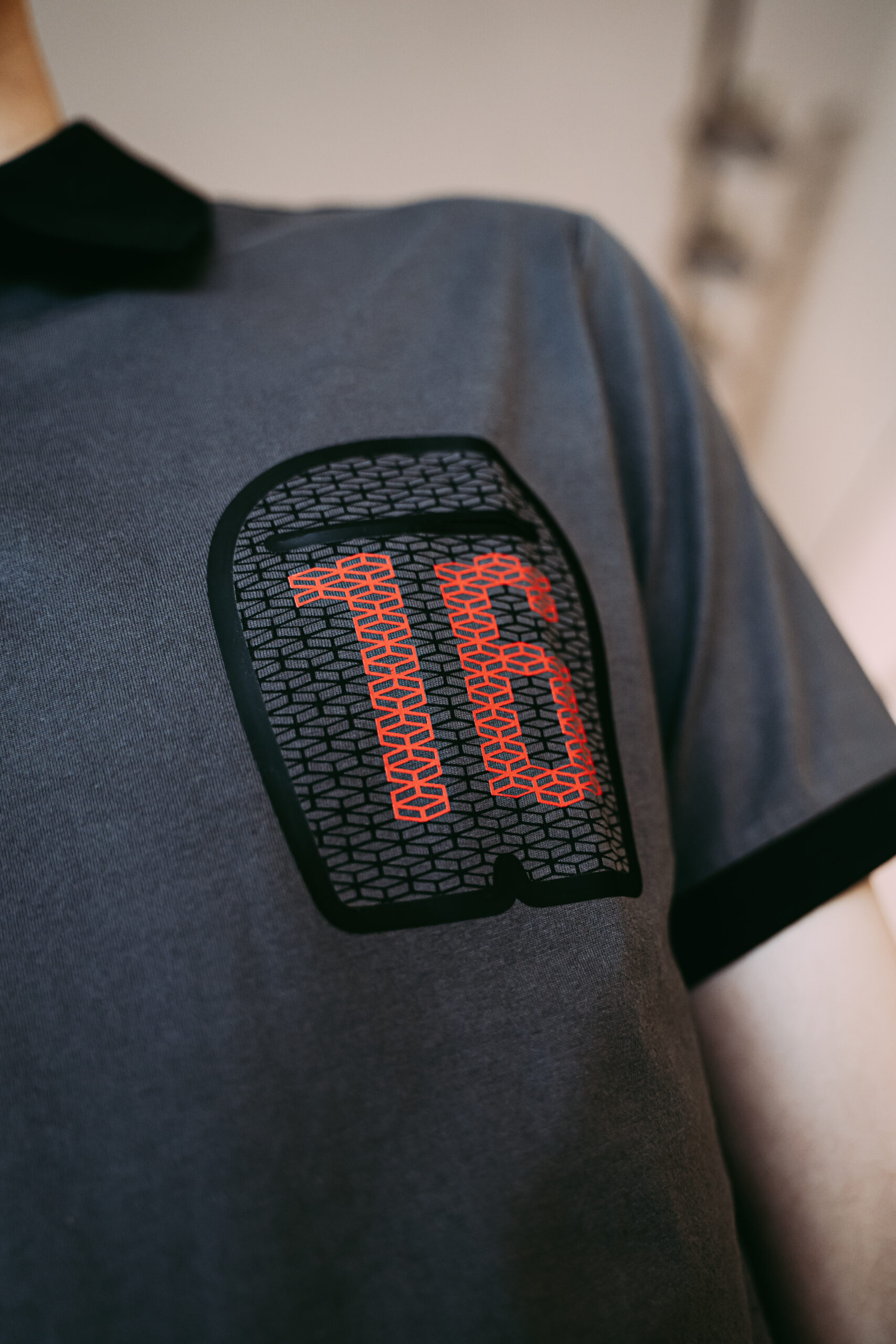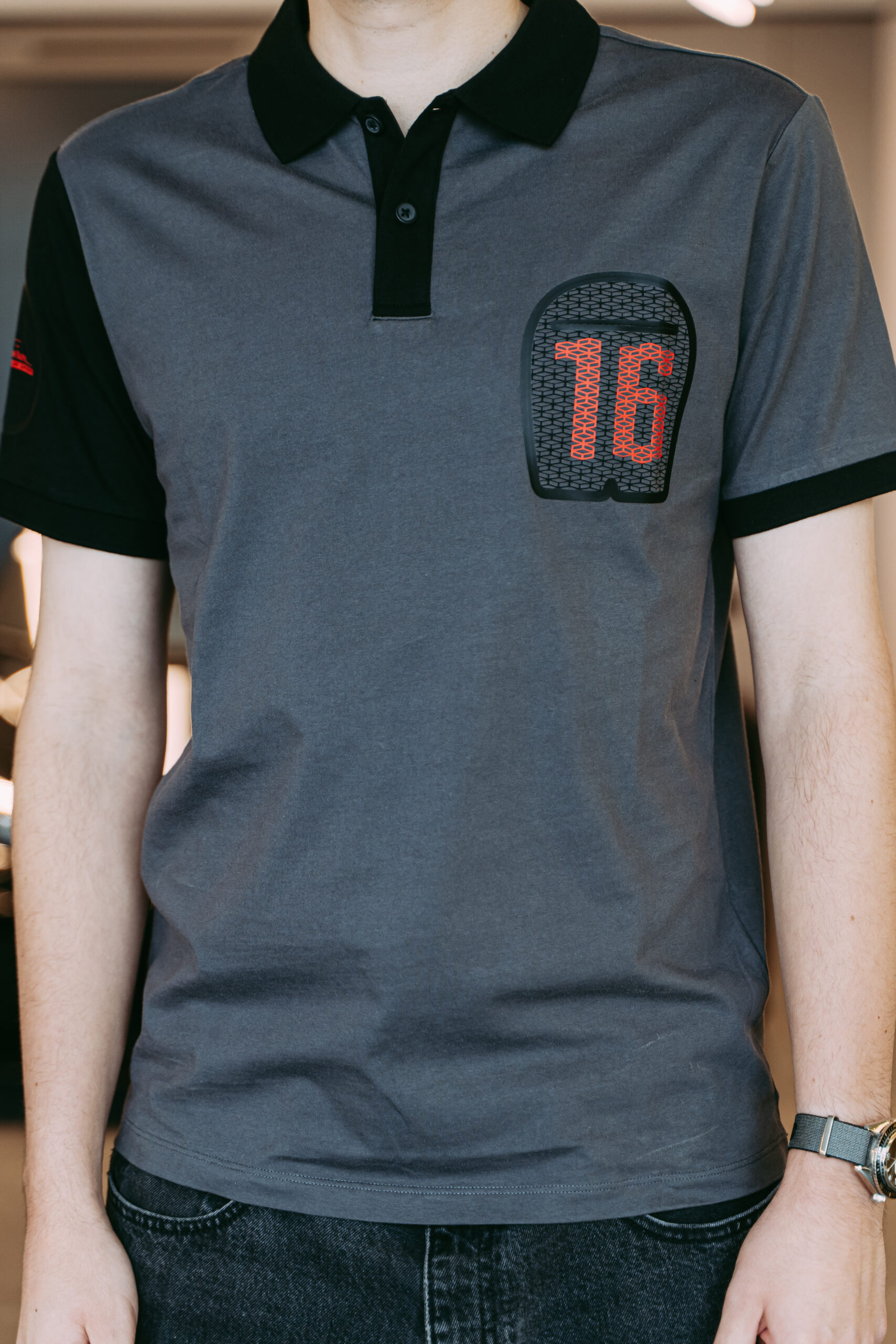 Stylowe połączenie elegancji i sportowego charakteru. To szare polo z krótkim rękawem wyróżnia się dużym emblematem z przodu, rękawami w dwóch kolorach oraz subtelnym nadrukiem z tyłu.