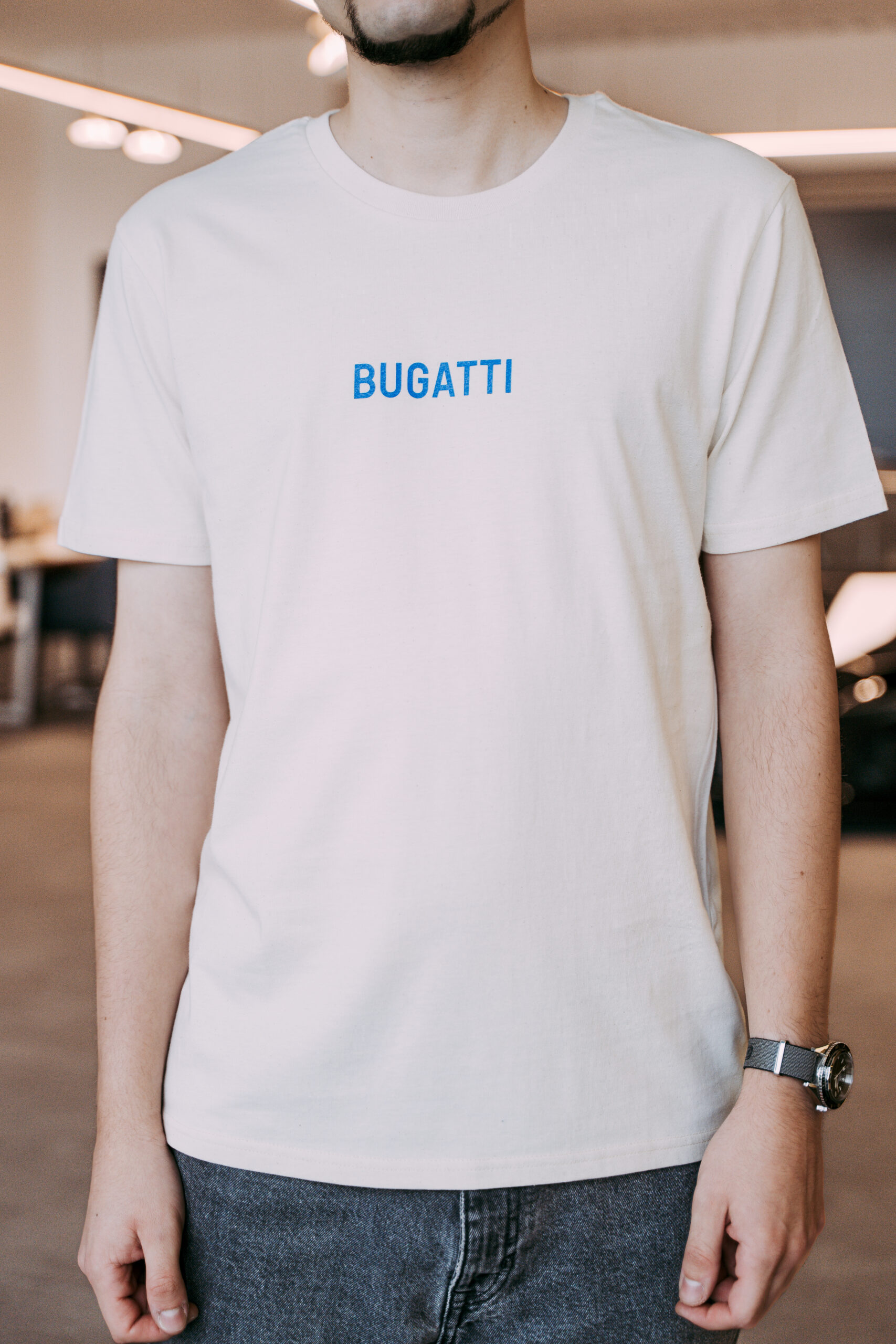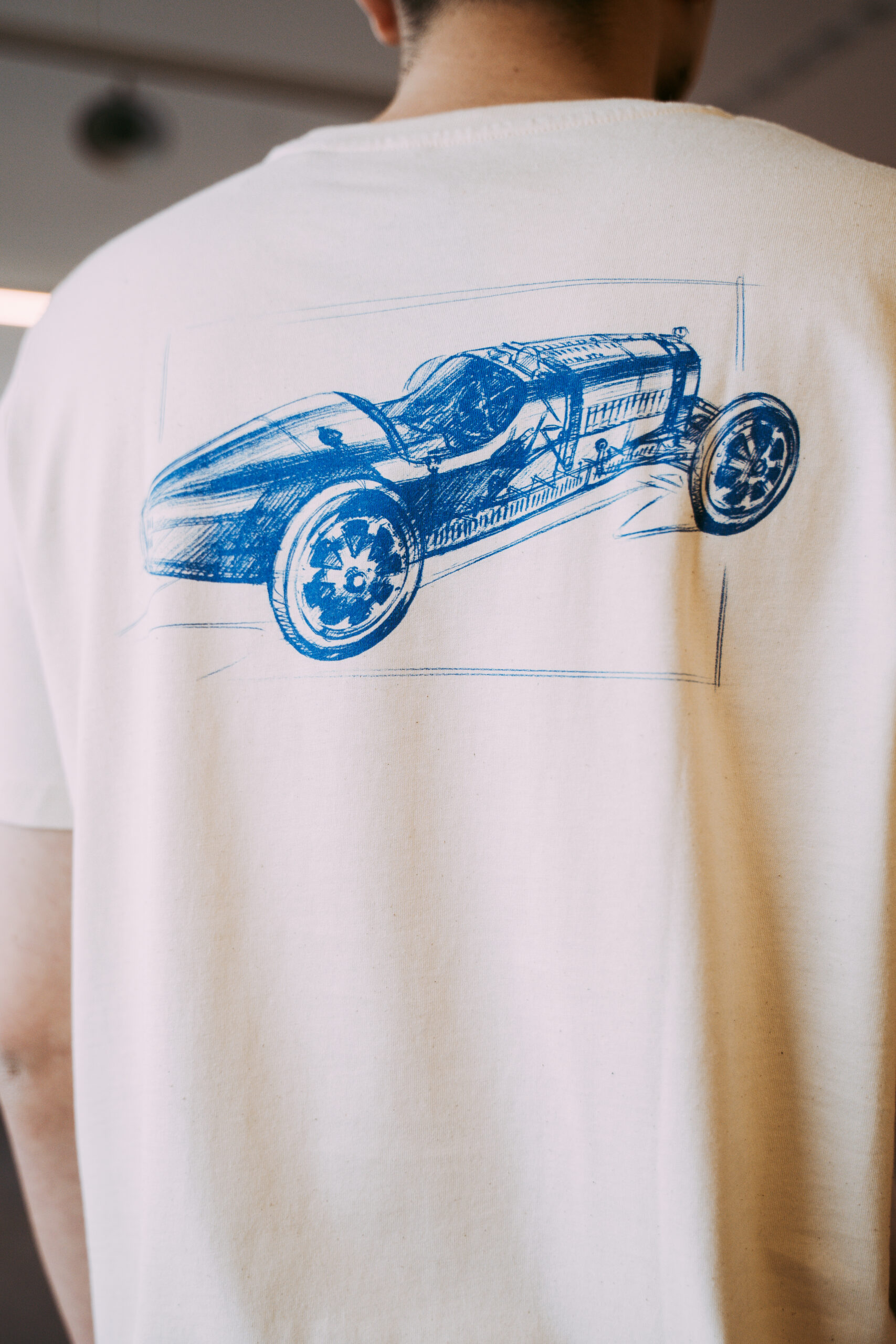 Koszulka z krótkim rękawem ozdobiona jest kultowym logo Bugatti na przodzie, a z tyłu znajduje się szkic legendarnego modelu Bugatti Type 35 w charakterystycznym odcieniu Bugatti Blue. To połączenie motoryzacyjnego dziedzictwa z nowoczesnym stylem.